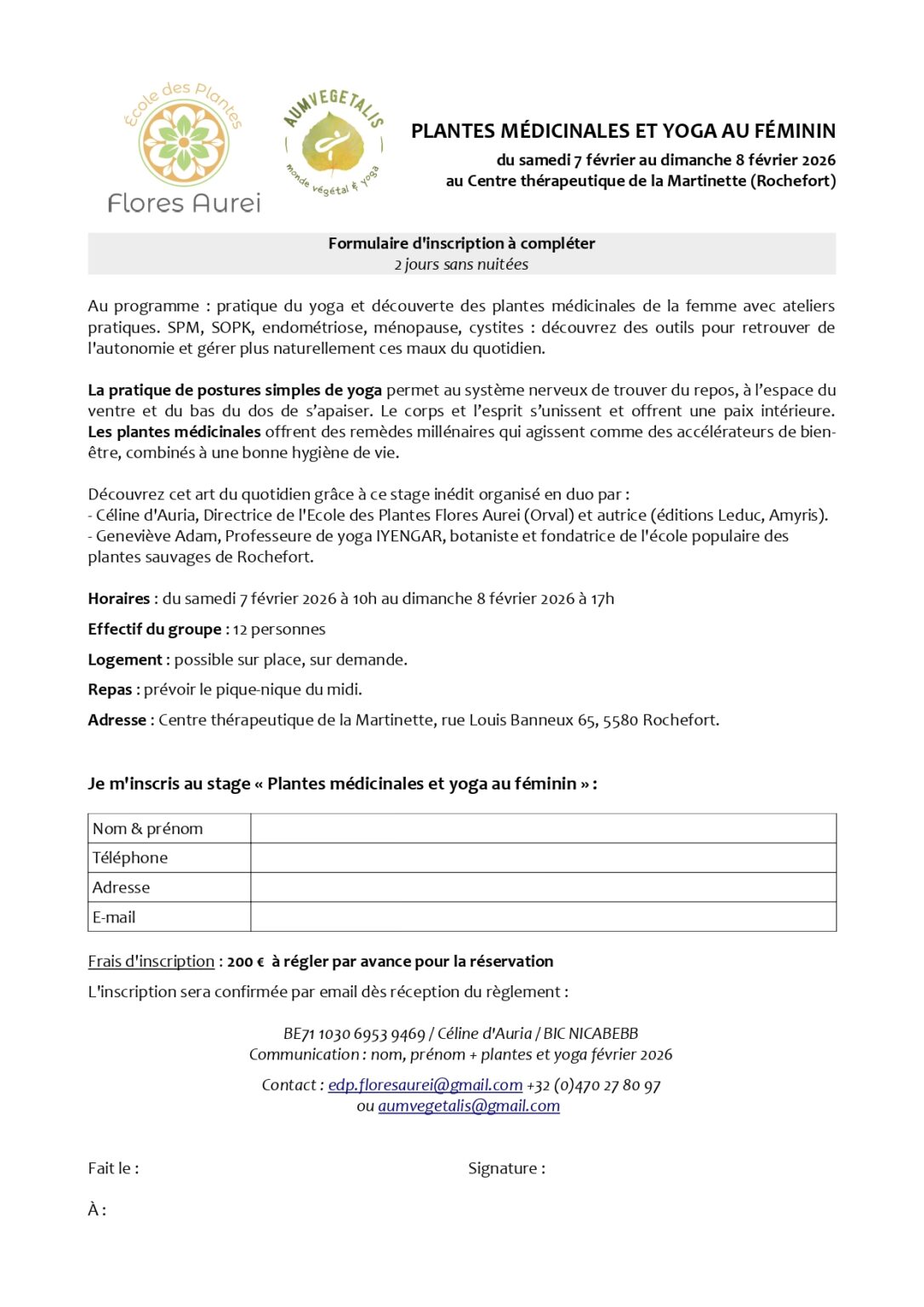 – Geneviève Adam, Professeure de yoga IYENGAR, botaniste et fondatrice de l’école populaire des plantes sauvages de Rochefort – Aumvegetalis – aumvegetalis@gmail.com – 00 32 474 52 16 15